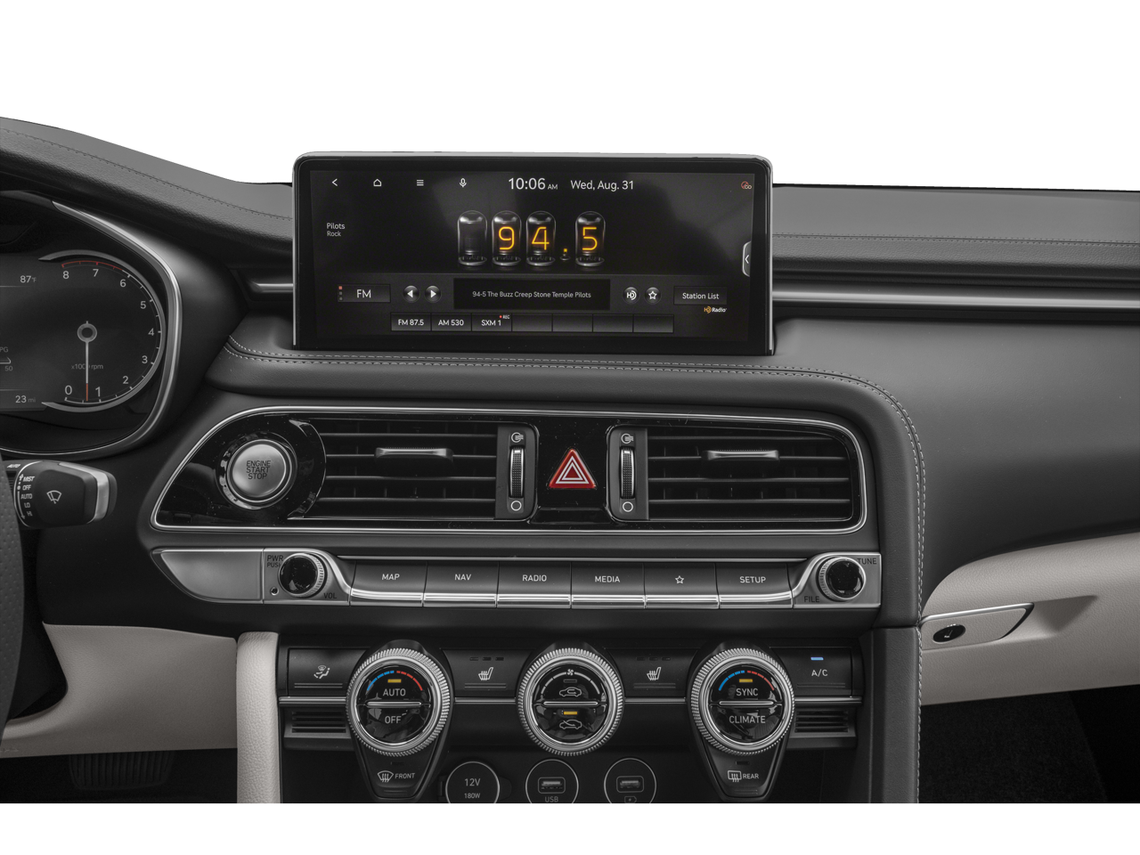 - Radio: AM/FM/SiriusXM/HD Audio System -inc: 6 speakers including subwoofer, 6 channel internal amplifier, speed-sensing auto volume control, 5th generation navigation system w/10.25" touchscreen, dynamic voice recognition, connected routing, over the air updates, Android Auto and Apple CarPlay, Bluetooth® hands-free phone system, steering wheel audio, cruise and phone controls, USB front and Genesis Connected Services