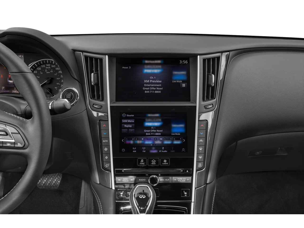 - Radio: INFINITI InTouch w/Navigation -inc: 16 speaker Bose Performance Series audio w/Bose Centerpoint simulated surround, dual HD display, navigation w/lane guidance, 3D building graphics, premium traffic and MapCare, voice recognition for navigation functions, including 1-shot voice destination entry, wireless Apple CarPlay, Siri Eyes Free, Android Auto, Bluetooth® hands-free phone system w/text messaging assistant, voice recognition for audio, Bluetooth® and vehicle information, streaming audio via Bluetooth®, 2 illuminated USB connection ports (1 type A, 1 type C), auxiliary audio input, HD Radio, SiriusXM radio w/advanced audio features w/3 month complimentary trial, SiriusXM Traffic w/3 month complimentary trial access to real-time traffic information, SiriusXM Travel Link w/3 month complimentary trial access to weather, fuel prices, stock prices, sports scores, movie listings and parking and Wi-Fi hotspot
