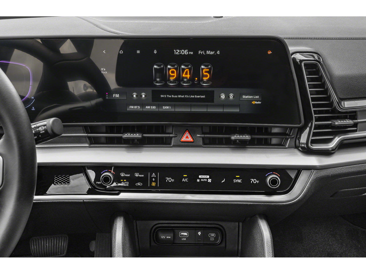- Radio: AM/FM/HD Audio System -inc: 12.3" touchscreen w/navigation, 6 speakers, Apple Carplay and Android Auto, Kia Connect, voice recognition, WiFi, map OTA, satellite radio, steering wheel mounted audio controls and Bluetooth® phone and streaming audio